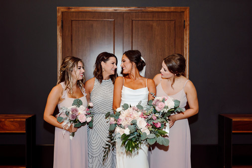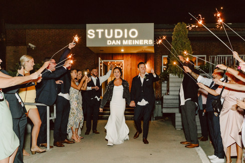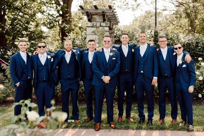 Have I mentioned before that I have the best job ever?! I not only get to meet some of the BEST people and but I also get to spend some of their best days with them, documenting every moment. One of my favorite summer days from my 2021 wedding season was Tommy and Sydney's beautiful summer wedding day in Kansas City. We started the day with the couple getting ready at the lovely Crossroads Hotel located in the heart of the Crossroads district, downtown Kansas City. Tommy and Sydney opted for no first look with each other, saving those feelings for the church aisle. The day continued with their ceremony and mass at Church of the Ascension in Overland Park, wedding party portraits at Loose Park and Stock Hill, and their dance-filled reception at event space, Studio Dan Meiners. The couple incorporated some really fun ideas into their wedding day like the girl's getting ready outfits with the groom's face all over them, a grand exit out of the church after their ceremony, having their dog join us for portraits, making an intentional stop for cocktails and conversation at the beautiful Stock Hill bar, a live artist painting during their reception, a personalized "I Love You 3000" neon sign (the perfect photo backdrop for any Marvel fan), fun glowsticks and light up accessories for the dance floor, Sydney's custom scripted and studded Mrs. Trueblood jean jacket and of course a classic sparkler exit.