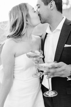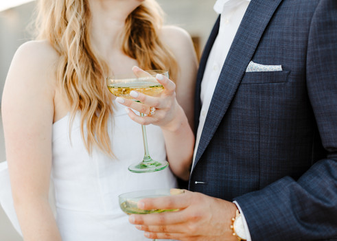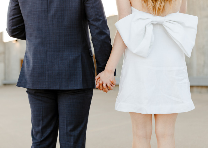 Truly I think two different and distinct looks for your engagement photos are the perfect recipe for success when planning your session, and this blog is the BEST example of that fact. Look one for Emma and Nathan was giving us classy, cute, cocktail, vibes to compliment the downtown scene. While the couple's second look gave us casual, fun, flirty vibes in the rolling green fields of the midwest! Regardless of whether you're team "two-looks" or not, the fact of the matter is, Emma and Nathan, nailed their summer engagement photos in downtown Lees Summit! Emma stunned in a white dress with an oversized bow against Nathan's classic navy suit. We wandered around the quaint downtown of their hometown, Lees Summit, hitting up some great city streets, sidewalks, brick walls, and rooftops. It was important to the couple that we incorporate their engagement gift of two champange glasses, in the colors of their upcoming wedding day. We popped champagne, poured drinks, and soaked up the setting sun on a nearby parking garage rooftop.